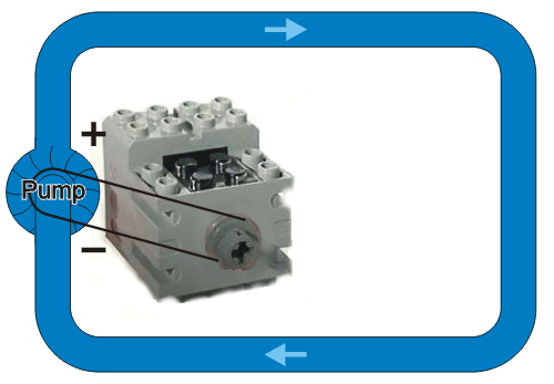 Let us start with a pump in a loop of water where the pump is powered by a small motor powered by a battery. If the Lego motor is allowed to spin freely, it will spin at a very high rate; however, when the motor is hooked up to the pump as is shown in Figure 0, the water will begin to flow but at a slower rate due to the natural resistance of the water. We are going to place a number of obstacles to the flow in the form of sand filters and the sand filters will resist the motor which is attempting to pushing the water through the pipe.