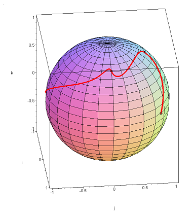 Figure 1. A spherical Spline connecting the points q0 = 0.6i + 0.8j, q1 = 0.6j + 0.8k, q2 = 0.6i + 0.8k, q3 = −0.8i − 0.6k.