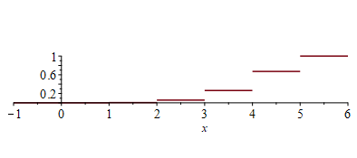 The probability density function is discontinuous, but Maple is not able to find the discontinuities (at this point), so we still see a stairstep function: