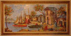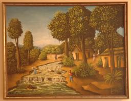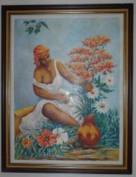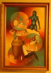 [an error occurred while processing this directive] Skip to the content of the web site.These are some of my paintings from Haiti. Please click to enlarge. Unfortunately, all of the paintings are anywhere from slightly damaged to seriously damaged (what appears to be a coffee spill in one case, cracks in others, and just poor handling for the rest), and this probably detracts from any value they have monetarily (c'est la vie), but fortunately, they are very beautiful and give my apartment a nice theme.