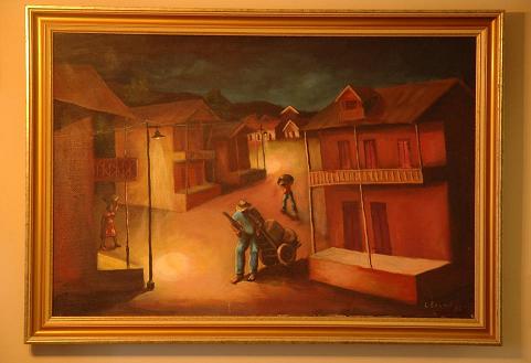 I like how everything in this painting appears to be straining under some form of burden. (Thanks, Ruth, for pointing this out.) The colours are appropriate. Oil on canvas.