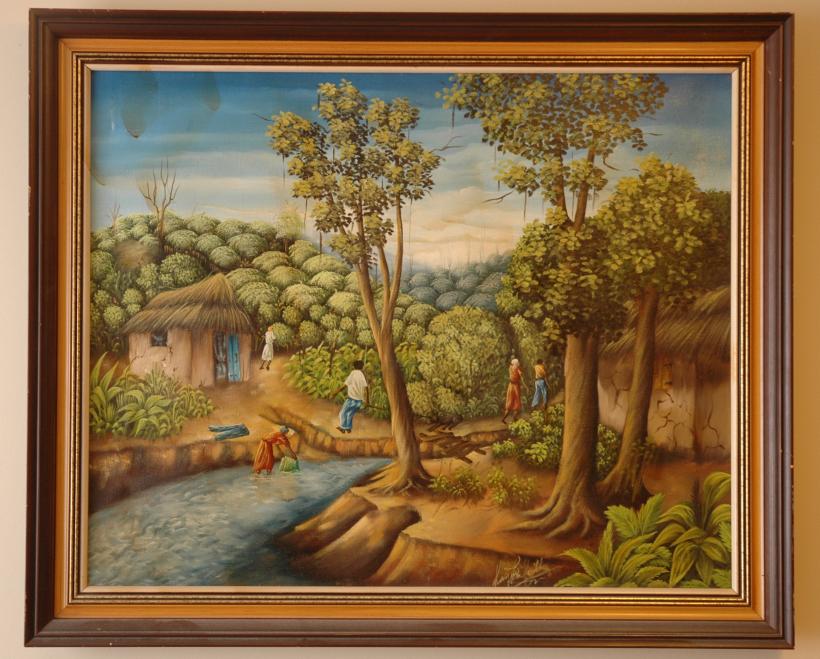 Simple and colourful. I wonder if Haiti is this green today, though. Pity about the coffee spill. Oil on canvas.