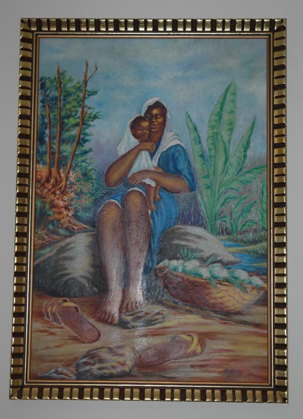 The room is too dark, so I had to use a flash. This is painted from the point of view of a child. I would have thought that this was obvious, but apparently not. Oil on board.
