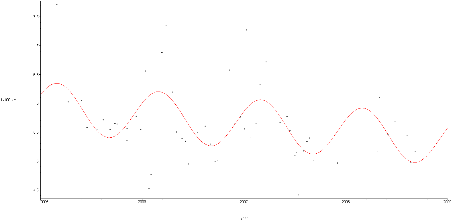 I plotted this data, and it seems that, as I keep the car longer, the fuel efficiency is improving. I am not really sure how to explain this; however, factors may include the quality of diesel and my driving habits.