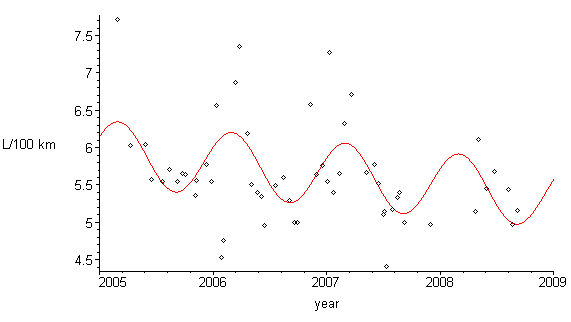 Figure 1. Plot of year versus fuel efficiency with a least-squares best fit of sinusoid and a straight line.