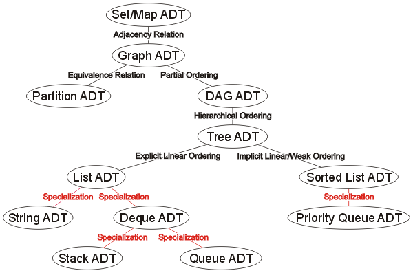 In some cases, namely the linear ordering, there will be numerous abstract data structures each which will specialize by emphasizing specific operations. In a sense, these relationships and specializations form a relationship of abstract data types as is shown in Figure 1. In some cases, the abstract data structures provide further required functionality as a result of relationship, and in others, there is a specialization based on a focus on specific operations at the expense of others.