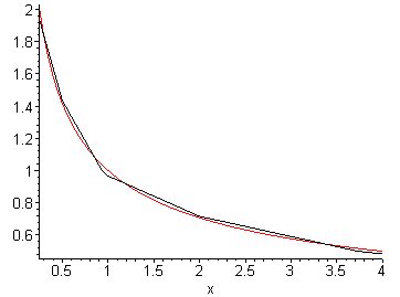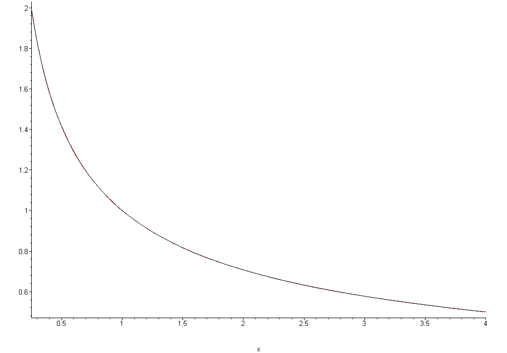 Figure 14. A plot of 1/√x and inv_sqrt_multiplier(x) on [0.25, 4].