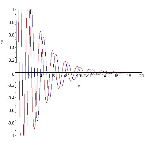 [> plot( [2.3*cos(3.23*x)*exp(-0.323*x), 2.3*sin(3.23*x)*exp(-0.323*x)], x = 0..20, y = -1..1, color=[red, blue] );
