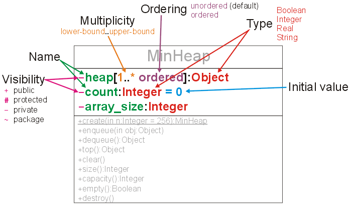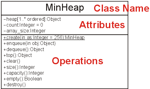 The MinHeap class stores an internal array (heap) capable of storing array_size objects. At any one time, it is holding count objects. These are the attributes or properties of an array. These attributes are recorded in the first box below the name of the class and are expanded upon in Figure 2. For obvious reasons, attributes are also sometimes referred to as properties.