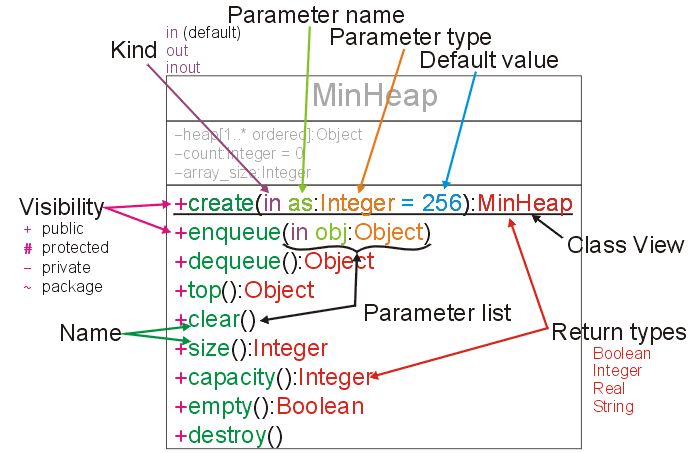 You may notice that there are some features in UML which cannot be directly translated to C++ and vice versa. For example, you cannot declare a parameter to be of Kind out, that is, the variable can be modified but not accessed. In C++, you can declare that a function cannot modify the object it is being called upon by placing const after the parameter list, e.g., int size() const. This cannot be shown in a UML Class Diagram. You may also note that, with the exception of initial values (which affect the constructors), nothing in the Class Diagram describes anything inside the body of the operations. The Class Diagram describes what the operations (functions) do, not how they work.