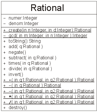 The UML Class Diagram for a Rational class is shown in Figure 6. In this class, there is the class operation gcd. This would suggest that such a function does not really belong in the Rational class, and thus, if time permitted, such a function may be implemented in a more appropriate location and the Rational class would then only call the gcd operation.