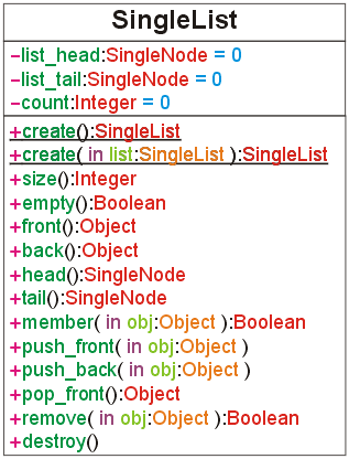 Figure 5. The UML Class Diagram for the class SingleList for Project 1.
