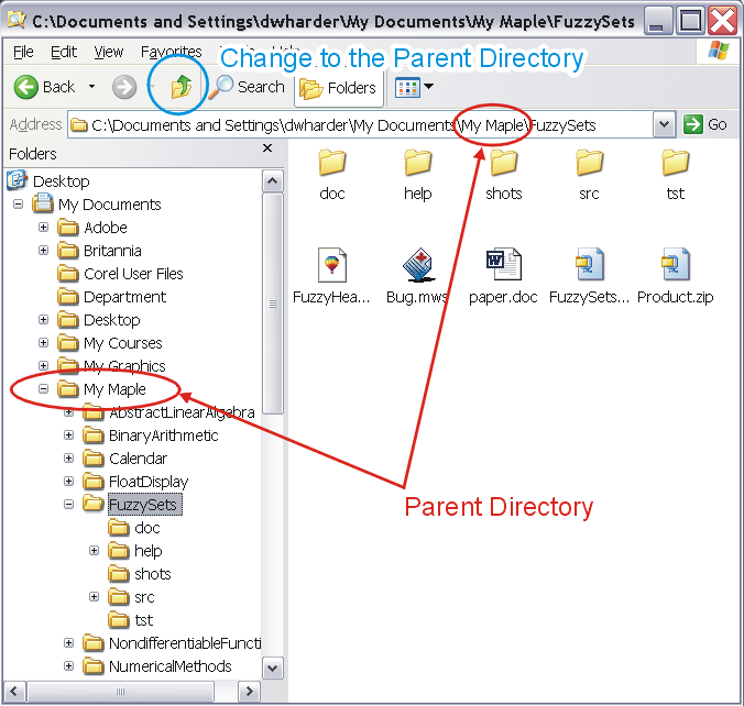 With the tree structure of directories, there is only one parent directory, that is, with one exception, all directories are located within another directory. In this example, Figure 4 shows the parent directory of the FuzzySets directory, namely My Maple. Because there is only one parent directory, you can reach it by selecting the Up button, a folder with a green upwards pointing arrow.