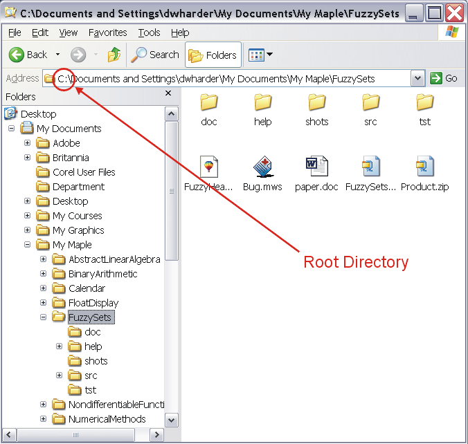 In Windows, the various directories which make up a path are concatenated together, each directory separated by a backslash \. In Unix and in OS X, the directories are separated by slashes /. The path of the working directory of this example, C:\Documents and Settings\dwharder\My Documents\My Maple\FuzzySets, is displayed in the Address text field in Figures 1 through 5.