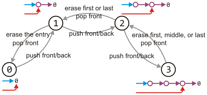 How large of a linked list do we have to test? If all our algorithms are tested on a linked list of size 1000, does that guarantee that it will work on a list of size 1001? Most likely, however, we don't need even that much: if all our algorithms work on a list of size three, this should guarantee that the algorithms work on all lists with more than three nodes. Thus, we only have to consider the states where the size is 0, 1, 2, and 3, and then we have to consider all transitions between these states. If you take a look at Figure 3, you will see such a state transition diagram. Those of you in computer engineering will see such diagrams in ECE 254 Operating Systems. Each transition is marked with the operations that may take you from one state to the next. For the case of erase, one could remove any of the nodes in the list, so there are multiple possible cases one would have to consider in the transitions.