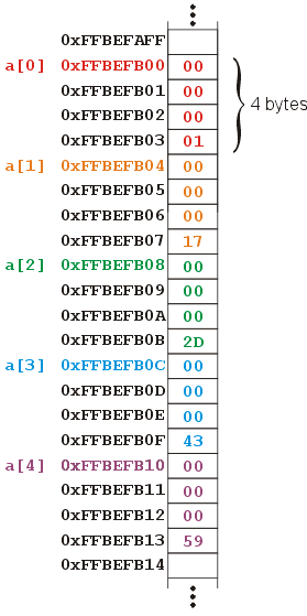 Note that the value stored by the array variable and the address of a[0] are equal. Each subsequent array entry is located at an address which is four bytes further (four bytes being the size of an array). This means that 5 × 4 bytes = 20 bytes have been set aside for this array. The actual storage would appear as shown in Figure 1.