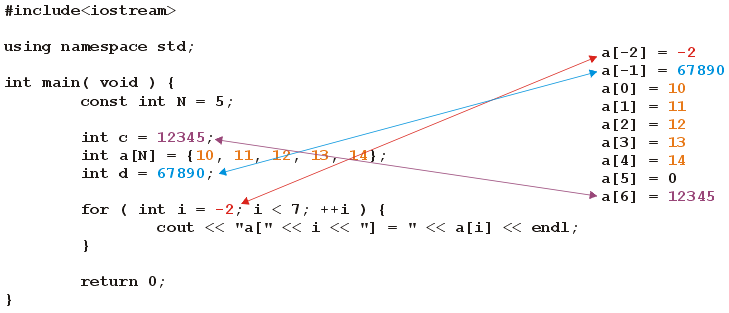 The first thing you may ask is: didn't I say that the array int a[5] has entries a[0] through a[4]? Yes, that is how much memory is allocated, however, nothing in C or C++ prevents you from accessing memory locations outside of that range.