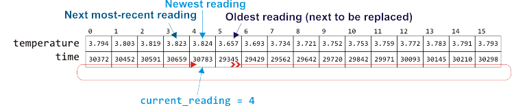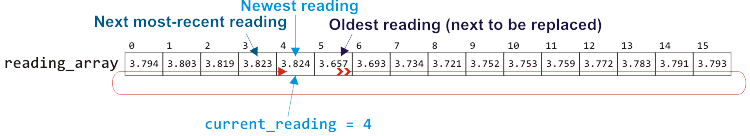 The field current_reading would be used to indicate where in the array the most recent reading was recorded. When a new reading comes in, the variable current_reading would be incremented and the new reading would be stored in that location. Thus, this is a cyclic array, as shown in Figure 2.