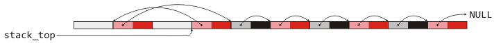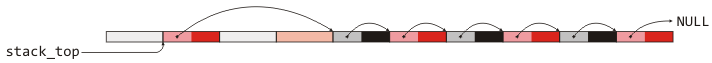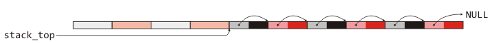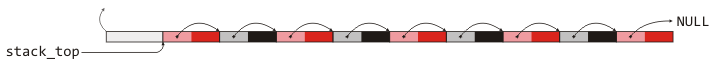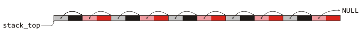 For example, if we started with a block of 80 bytes, we could divide this into blocks of 8 bytes. This would leave us with 10 blocks that could be allocated. In order to track these, when the blocks are not assigned, we will cast each block as a pointer (that is, a 4-byte address assuming we are dealing with a 32-bit machine). We then assign the top of the stack to point to the address of the block of memory, the first four bytes of that block are used to store the address of the next block, and so on, until we get to the end where the address stored will be NULL indicating the base of the stack. This is shown in Figure 1.
