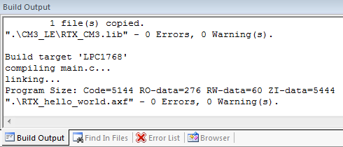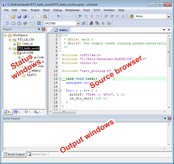 The development environment allows you code and define projects, to build those projects, and to load the exeutables onto the Keil evaluation board. In order to facilitate this, the layout is broken into three windows: