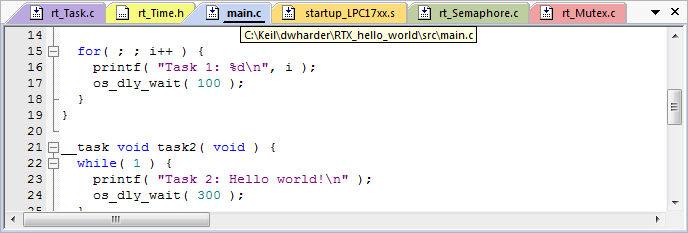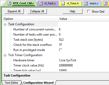 Certain files can be marked up so as to be edited not by changing the source code, but by using an interactive configuration window. One such file is RTX_Conf_CM.c, which allows the user to select the Configuration Wizard by selecting the appropriate tab at the bottom of the soruce file, as shown in Figure 5.