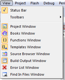 Figure 2. The view menu with a list of tabs available in the Status (first four) and Output (last four) windows.