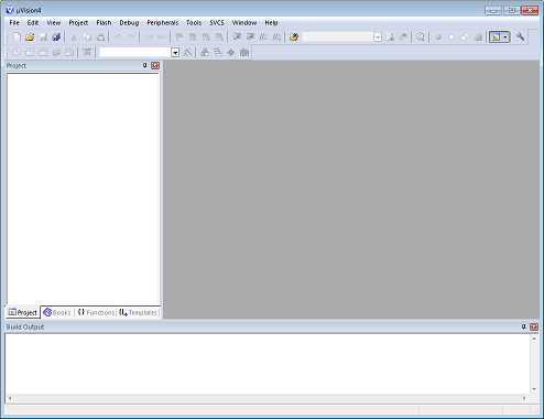 After installation, you will want to launch the μVision IDE. The executable will have a path name something like C:\Keil\UV4\UV4.exe (depending on your destination folder). When you launch it, you will be greated with an empty environment something like Figure 3.
