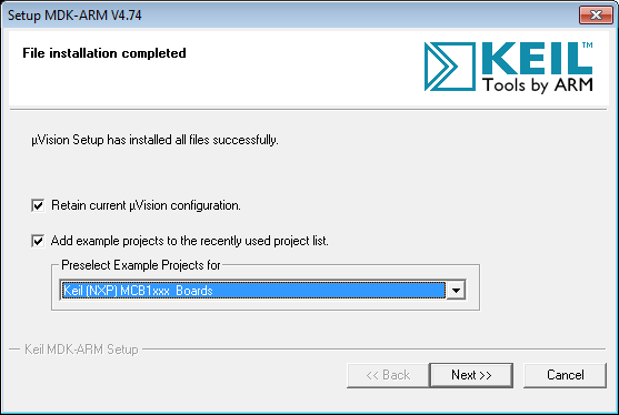 During the installation process, you will be asked to preselect example projects for one of multiple possible boards. Please choose the Keil (NXP) MCB1xxx Boards, as shown in Figure 2. Your board in the laboratory will be the MCB17000.