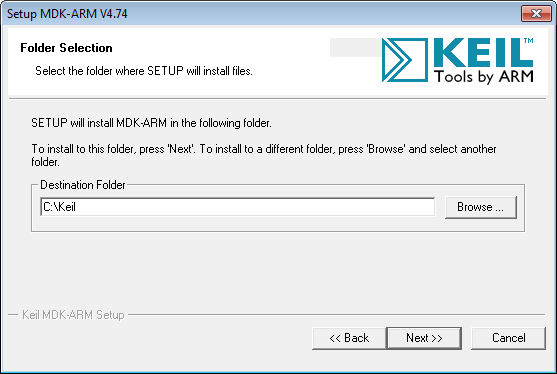 When you launch the installer, you will see a set-up dialog prompting you for destination folders, as shown in Figure 1. Please be sure that the path name does not contain any spaces. I would suggest, for example, C:\Keil.