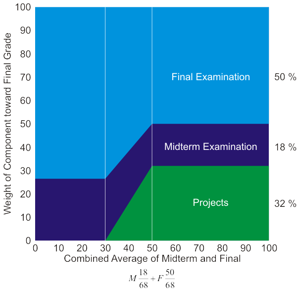Otherwise, the weight of the projects will drop linearly from 32 % to 0 % as the calculated grade of your midterm and final drops from 50 % to 30 %, as is shown in Figure 1.