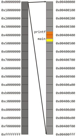 For example, in C, every function name is assigned the address in memory for the first instruction for that function. Thus, if you call main or printf, the program knows where to go to start executing. For example, this simple program prints the addresses of the two functions int main() and int printf():