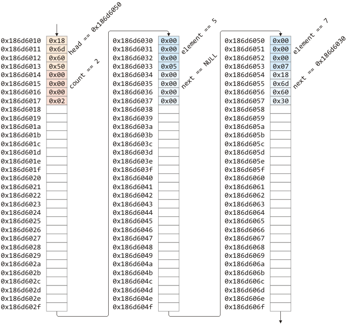 Figure 3. The memory map at the point at which the linked list has two elements.