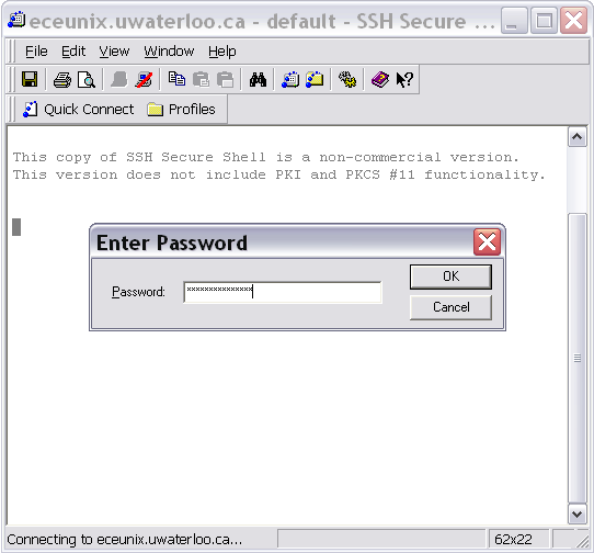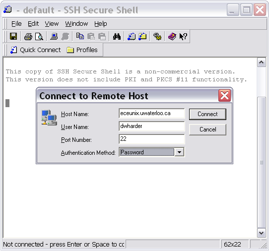 The Host Name used in this example is ecelinux.uwaterloo.ca, the User Name is your UW User ID, and the Authentification Method should be changed to Password. When you press Enter, the client will make a connection with remote host with the name ecelinux.uwaterloo.ca. This computer is located in E2.