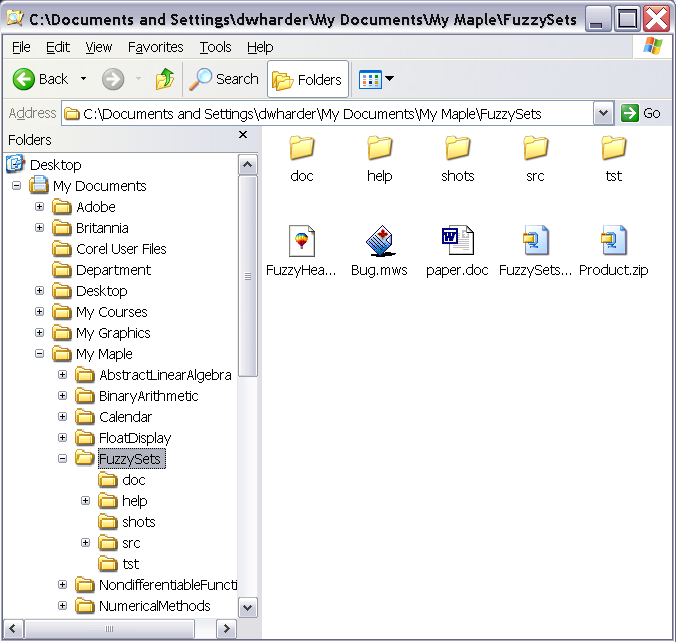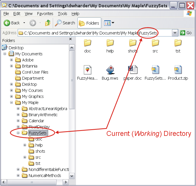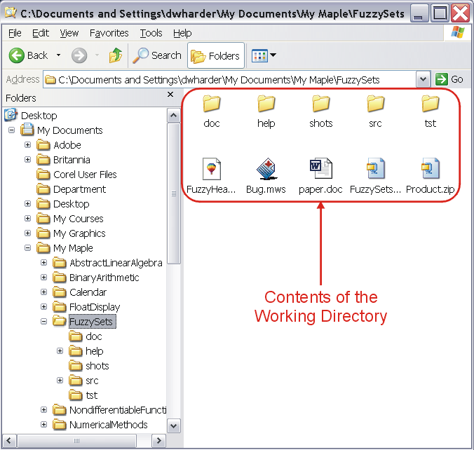 In Windows, the various directories which make up a path are concatenated together, each directory separated by a backslash \. In Unix and in OS X, the directories are separated by slashes /. The path of the working directory of this example, C:\Documents and Settings\dwharder\My Documents\My Maple\FuzzySets, is displayed in the Address text field in Figures 1 through 5.