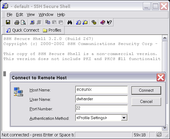To connect to ecelinux, click Quick Connect on the tool bar. This brings up the Connect to Remote Host dialog shown in Figure 2.