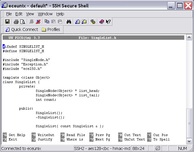 Figure 1. Screen shot of pico editing the file SingleList.h.